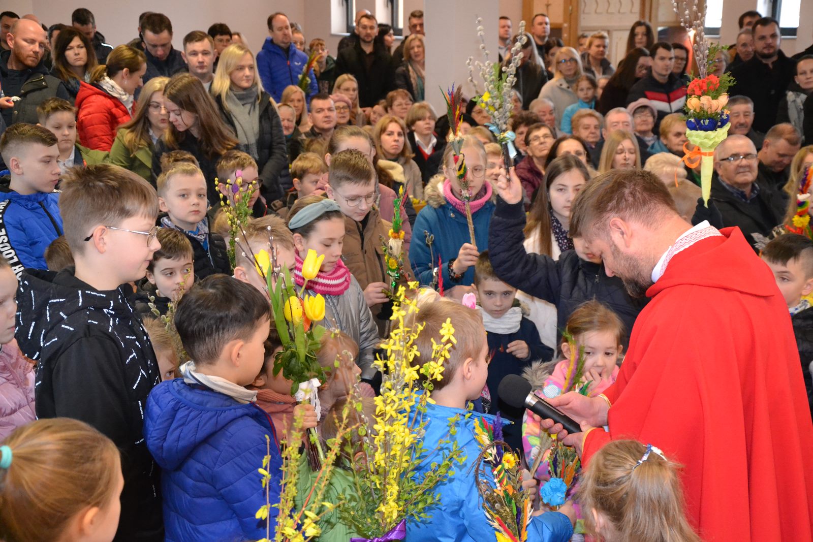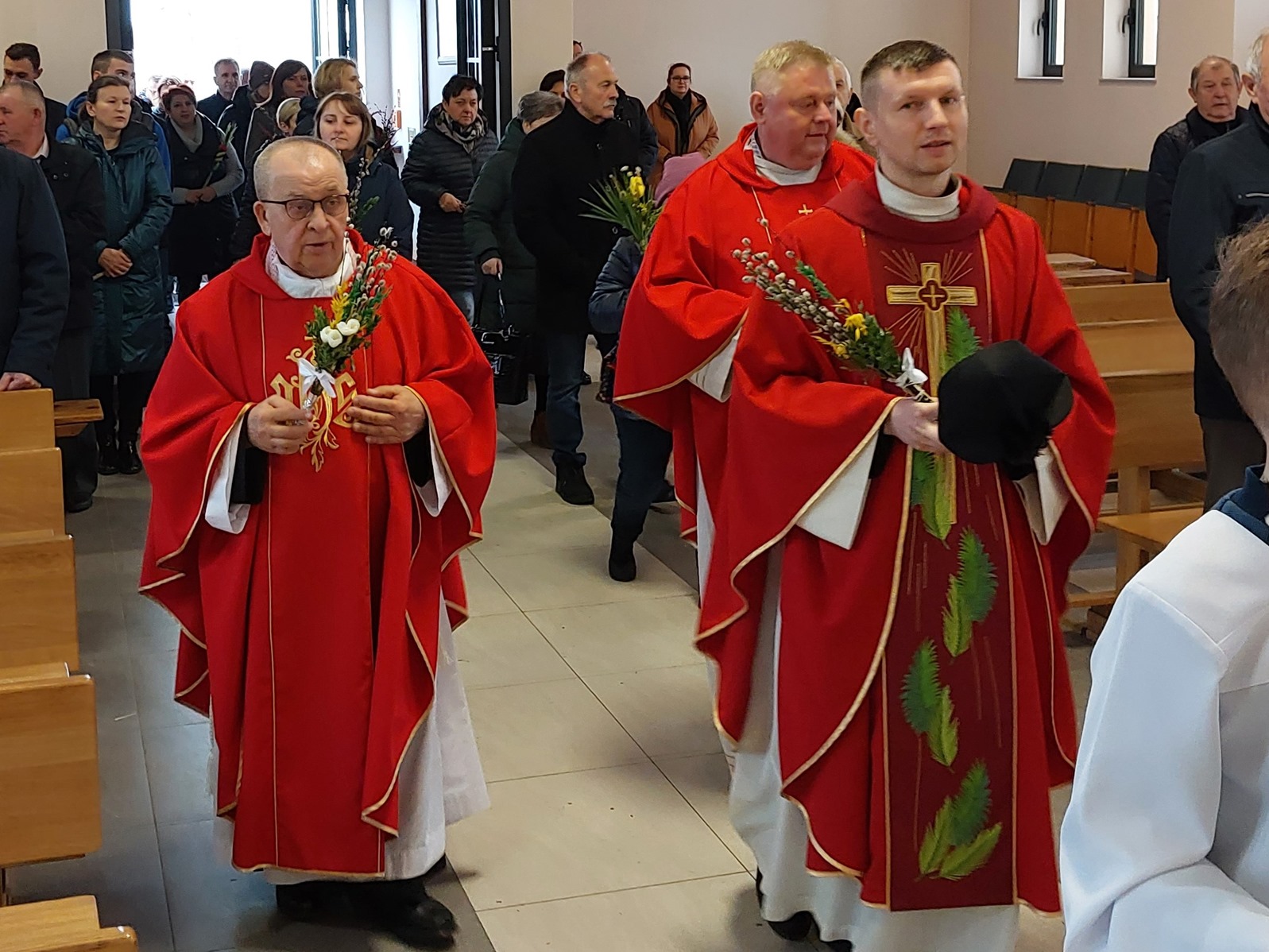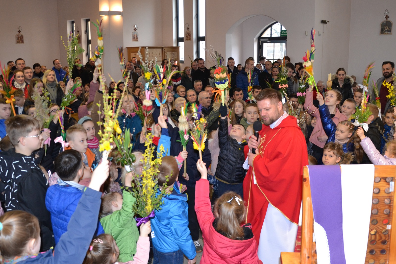 02 kwietnia 2023 przeżywaliśmy Niedzielę Palmową. Podczas Mszy Świętej o godzinie 10.30 dzieci zaprezentowały swoje palmy i wraz z ks. Pawłem Padyszem omówiły ich symbolikę i rozmawiały o zbliżającym się Triduum Sacrum. O 12.00 zaś wysłuchaliśmy Ewangelii o wjeździe Jezusa do Jerozolimy i przeszliśmy w procesji z palmami.