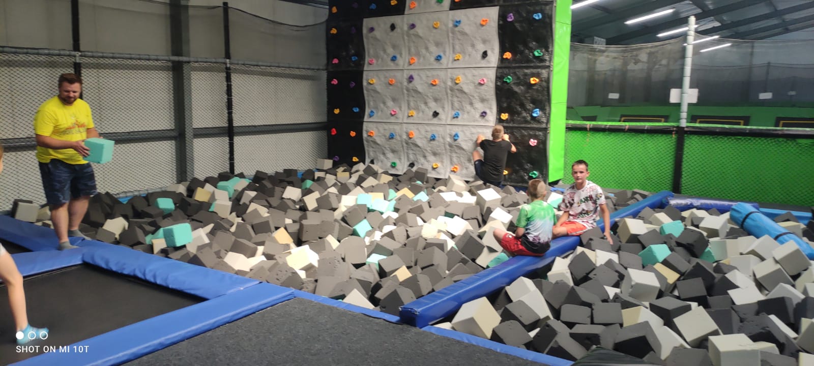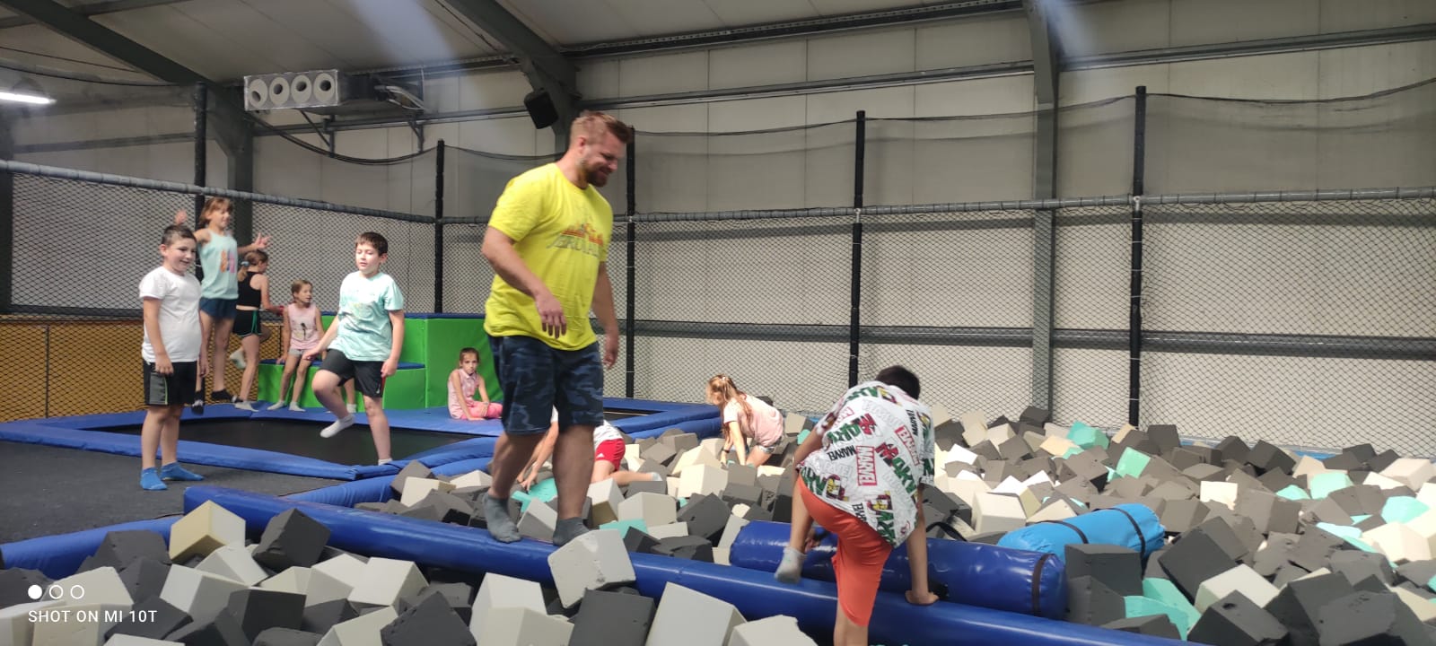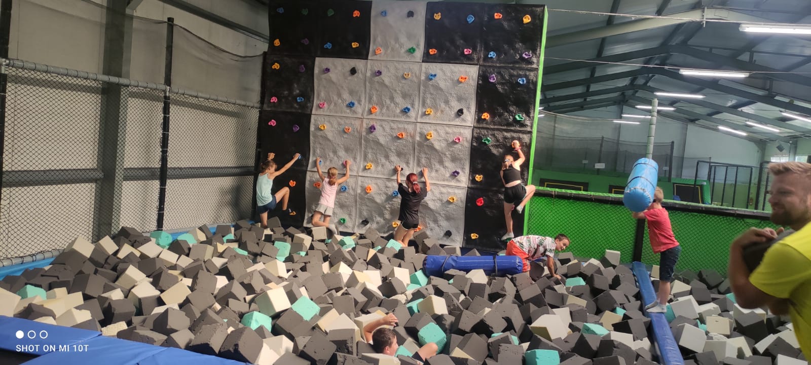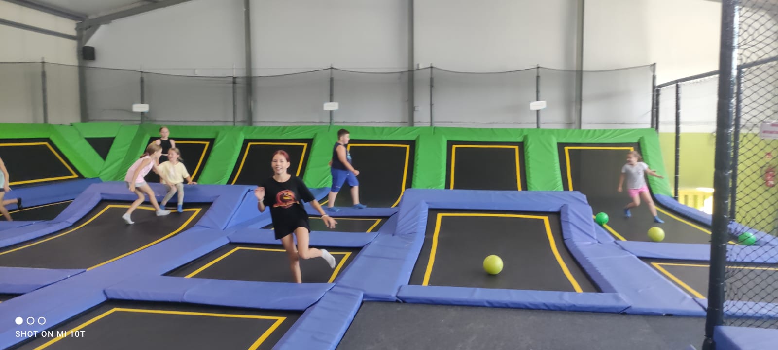 Kolejny dzień to szaleństwo w parku trampolin. Podskoki, salta, pokonywanie przeszkód, rzuty do kosza, wyskoki i upadki w basenie gąbek – to tylko niektóre atrakcje, które towarzyszyły naszej wesołej grupie. Na wszystkich twarzach spływały krople potu. Jednak nie był to pot wyczerpania, raczej radości z możliwości wyrażenia siebie, wykrzyczenia, wytańczenia. W zabawie uczestniczyli też opiekunowie – p. Monika wytrwale fotografowała wybryki, ksiądz Paweł podrzucał gąbki, które dzieci miały za zadanie złapać i robiły to naprawdę ambitnie.