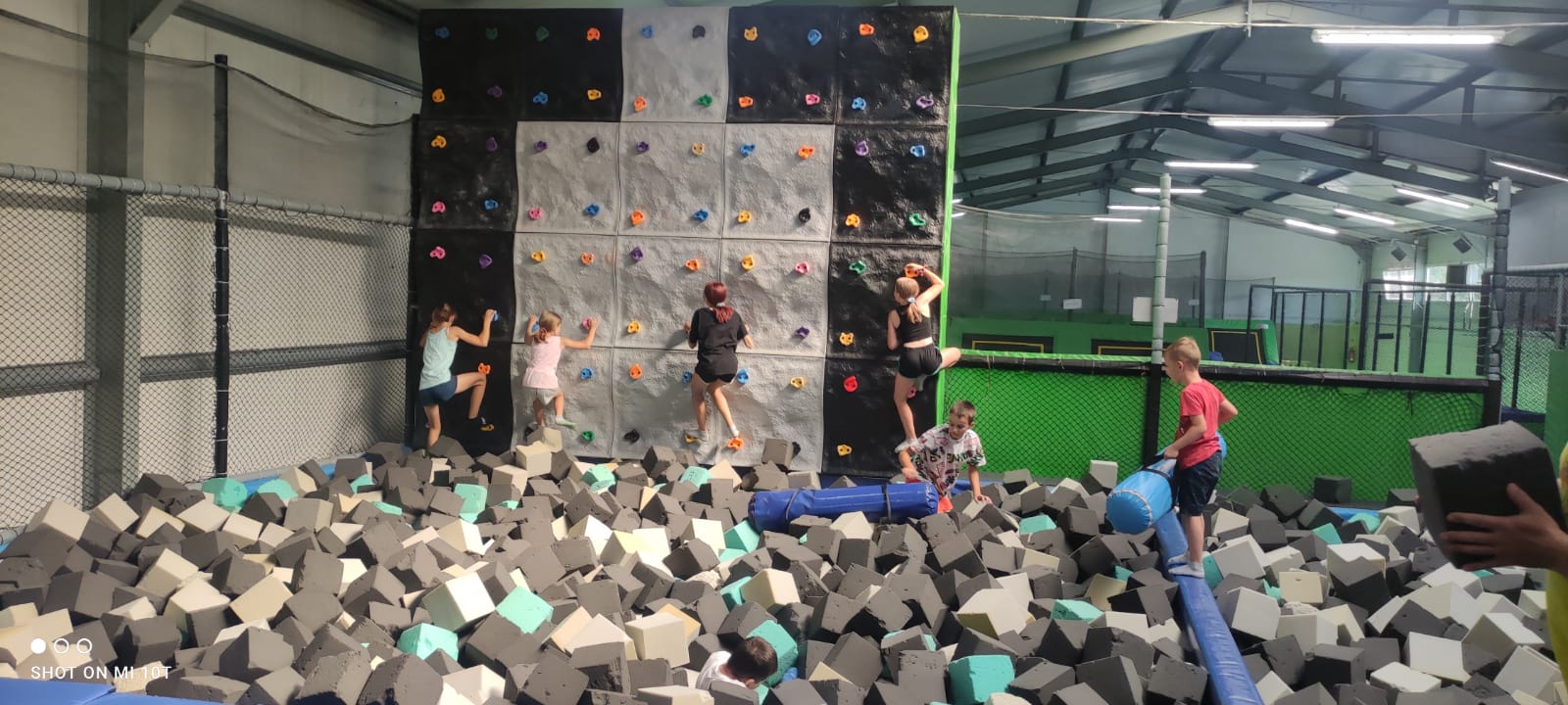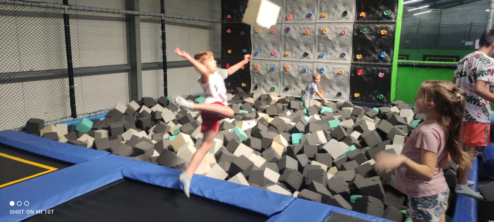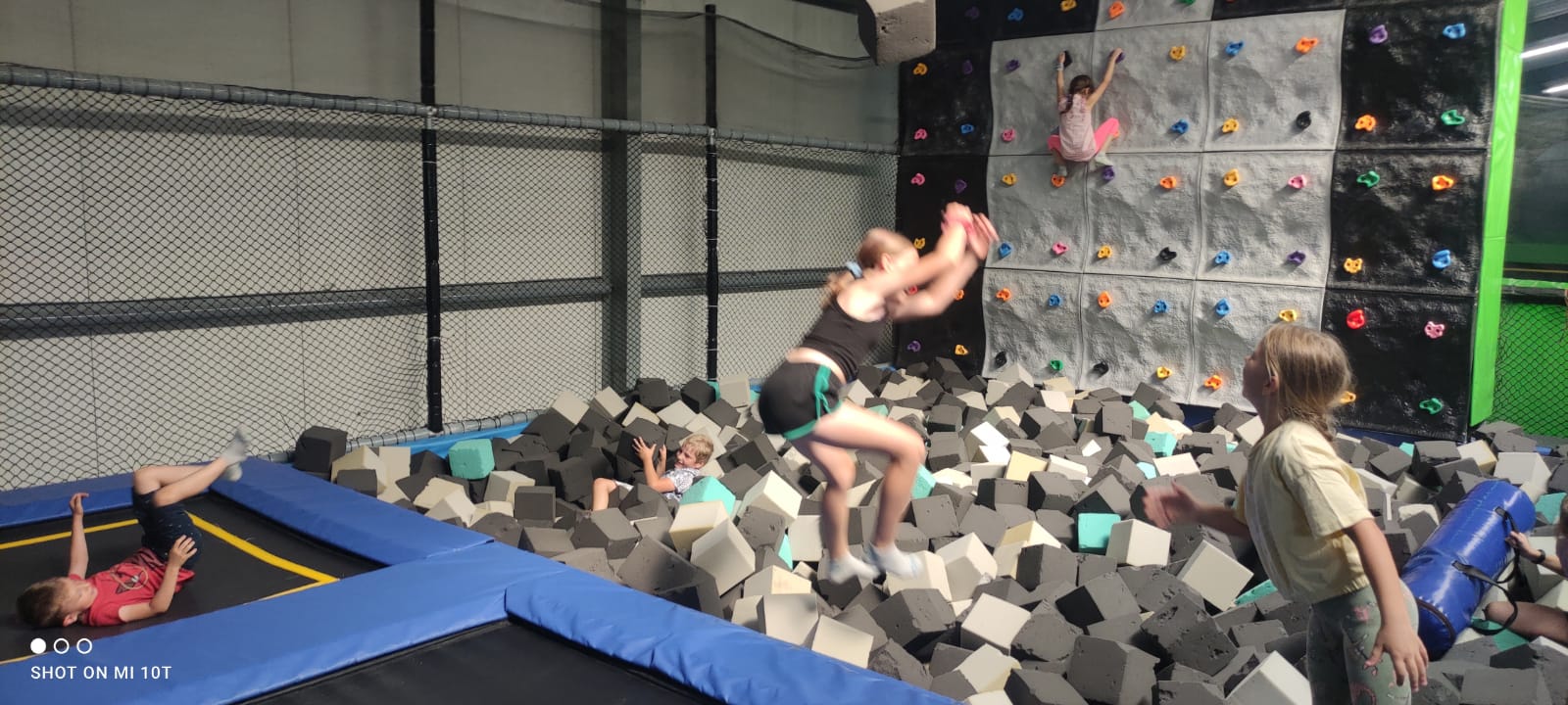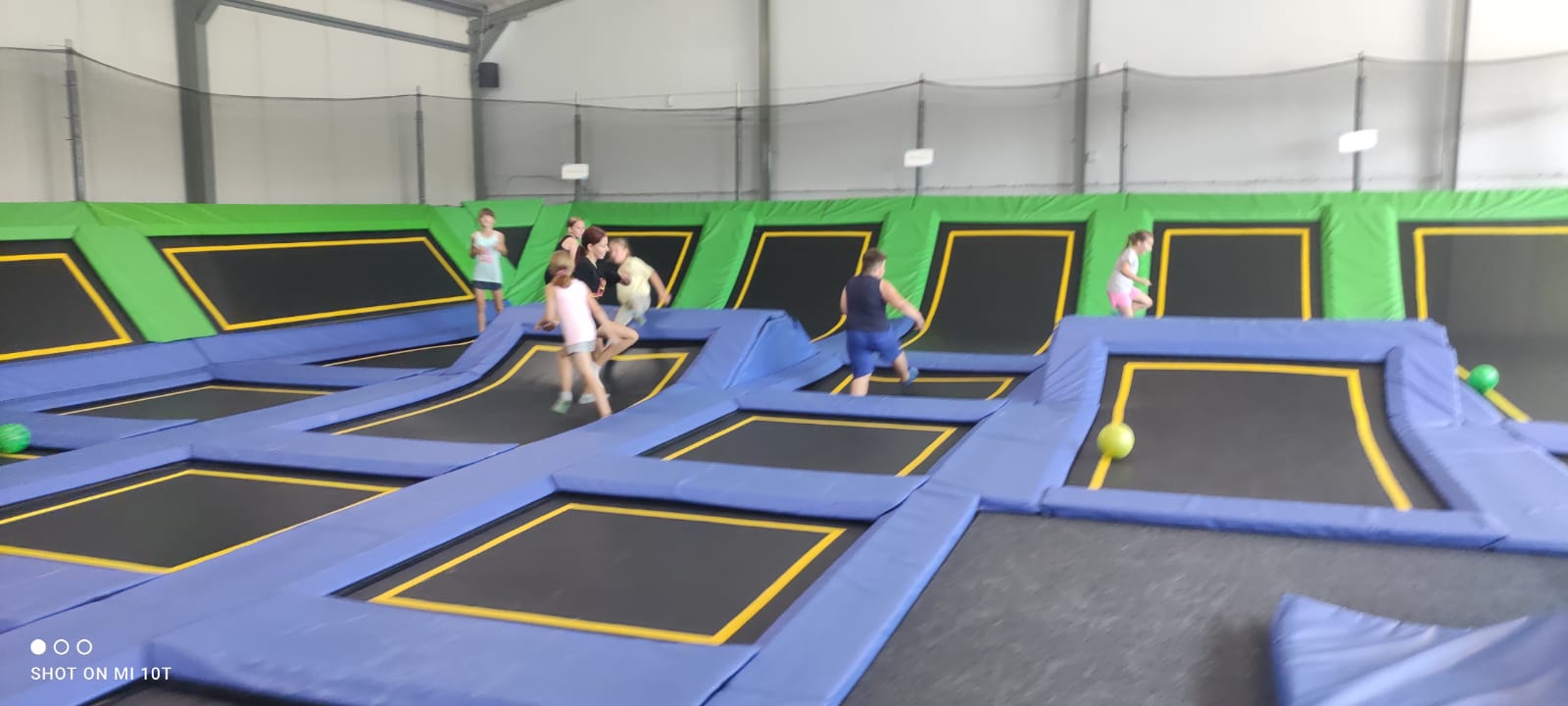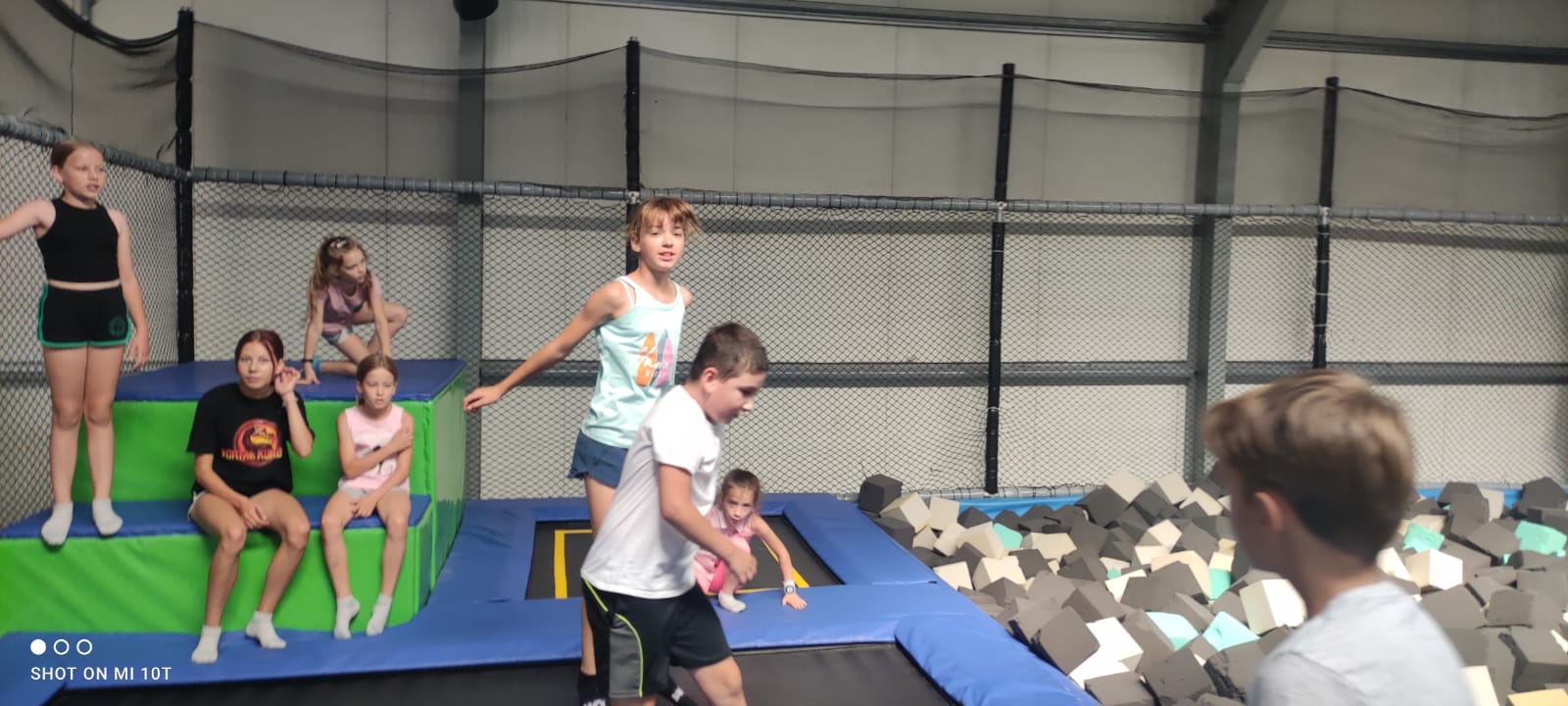 Kolejny dzień to szaleństwo w parku trampolin. Podskoki, salta, pokonywanie przeszkód, rzuty do kosza, wyskoki i upadki w basenie gąbek – to tylko niektóre atrakcje, które towarzyszyły naszej wesołej grupie. Na wszystkich twarzach spływały krople potu. Jednak nie był to pot wyczerpania, raczej radości z możliwości wyrażenia siebie, wykrzyczenia, wytańczenia. W zabawie uczestniczyli też opiekunowie – p. Monika wytrwale fotografowała wybryki, ksiądz Paweł podrzucał gąbki, które dzieci miały za zadanie złapać i robiły to naprawdę ambitnie.