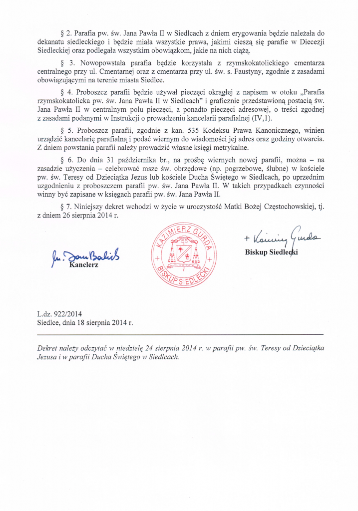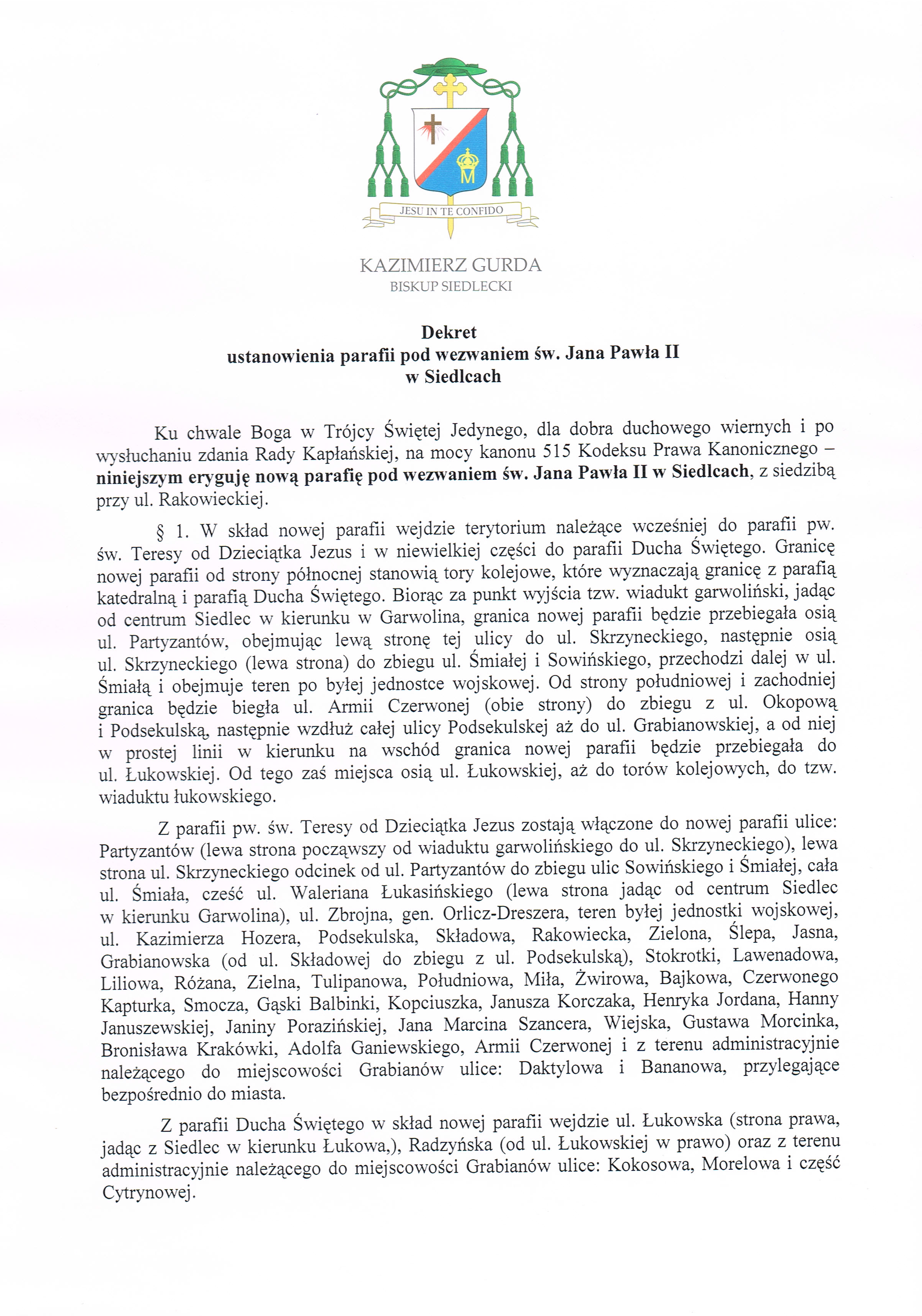 Parafia pw. św. Jana Pawła II została erygowana dnia 26 sierpnia 2014 r. przez biskupa siedleckiego Kazimierza Gurdę obejmując wiernych z terenu par. pw. św. Teresy od Dzieciątka Jezus i par. Ducha Świętego.