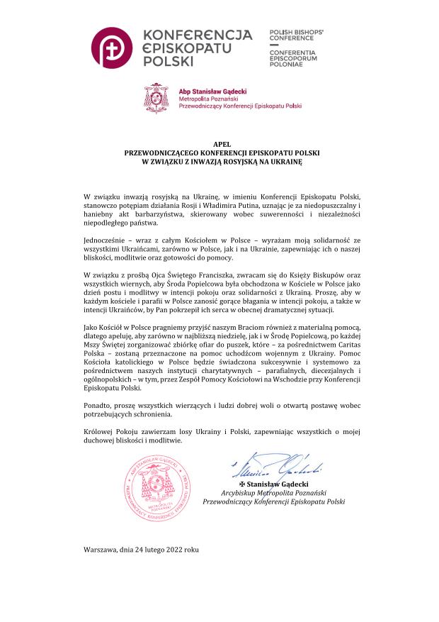 Apel Przewodniczącego Konferencji Episkopatu Polski w związku z inwazją rosyjską na Ukrainę, który należy odczytać we wszystkich kościołach i kaplicach w niedzielę 27 lutego br. Zgodnie z tym Apelem, jak również odpowiadając na prośbę Ojca Świętego Franciszka, Środa Popielcowa będzie obchodzona w Polsce jako dzień postu i modlitwy w intencji pokoju oraz solidarności z Ukrainą. Proszę zatem, aby zachęcić swoich Parafian do podjęcia tej inicjatywy. Proszę także – zgodnie z moją decyzją z 15 lutego br. – aby nadal podczas każdej Mszy św. w modlitwie wiernych zanosić wezwanie w intencji pokoju na Ukrainie,