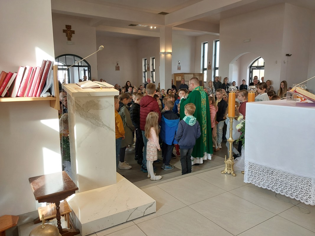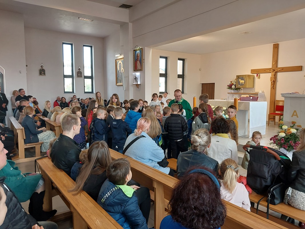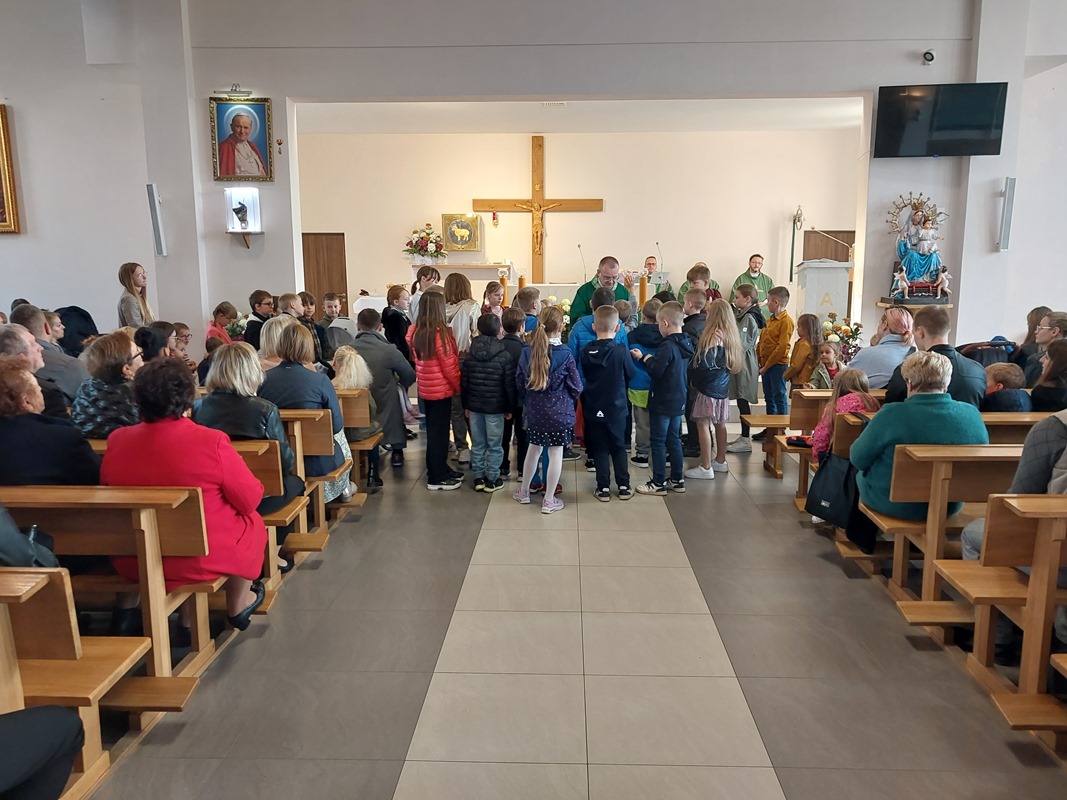 Podczas Mszy Świętej o godzinie 10:30, z dziećmi podczas homilii spotkał się Proboszcz – ks. dr Jarosław Oponowicz. Rozmawiał z nimi o naszym patronie i wprowadził dzieci w życie modlitewne Jana Pawła II. Po zakończonej Eucharystii dzieci mogły spróbować kremówek, które jak wiemy lubił Papież Polak.