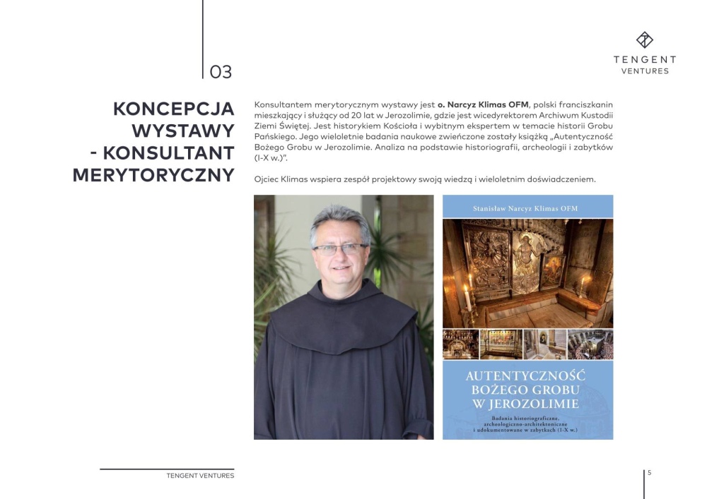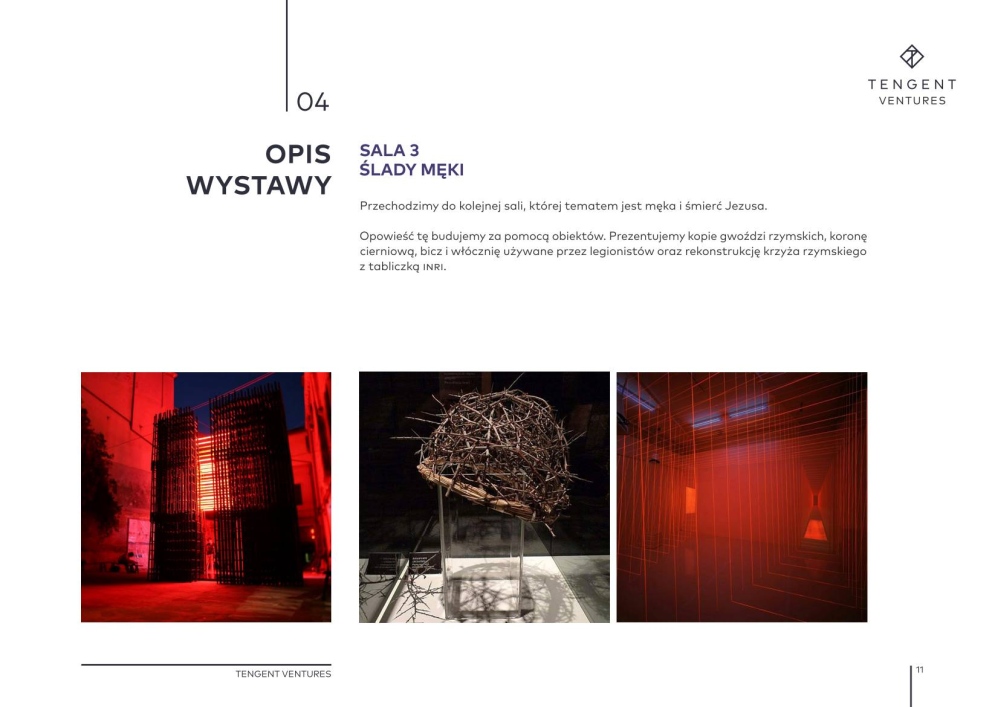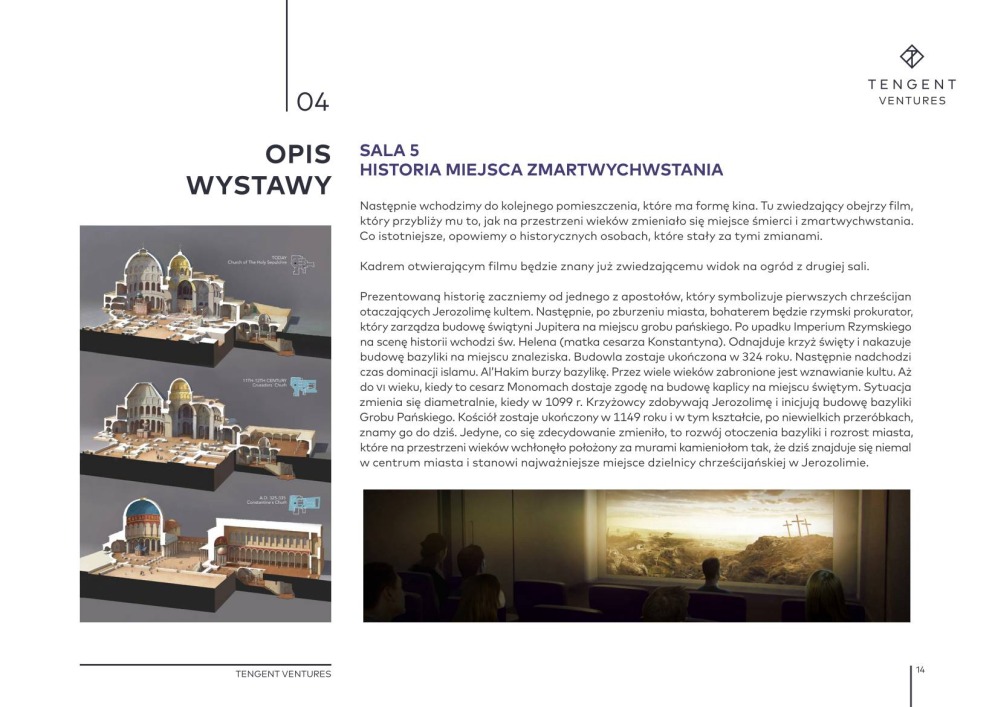 Wystawa została zaprojektowana tak, by przemawiać zarówno do umysłu, jak i serca. Dostarcza wiedzę i oferuje duchowe przeżycie. Zwiedzający będą mogli między innymi stanąć u stóp Golgoty, poznać historię Bożego Grobu, obejrzeć wyjątkowe obiekty związane z historią Jezusa i pomyśleć o swojej roli w tej opowieści – wyjaśnia Krzysztof Noworyta ze studia Tengent, producent i pomysłodawca wystawy.