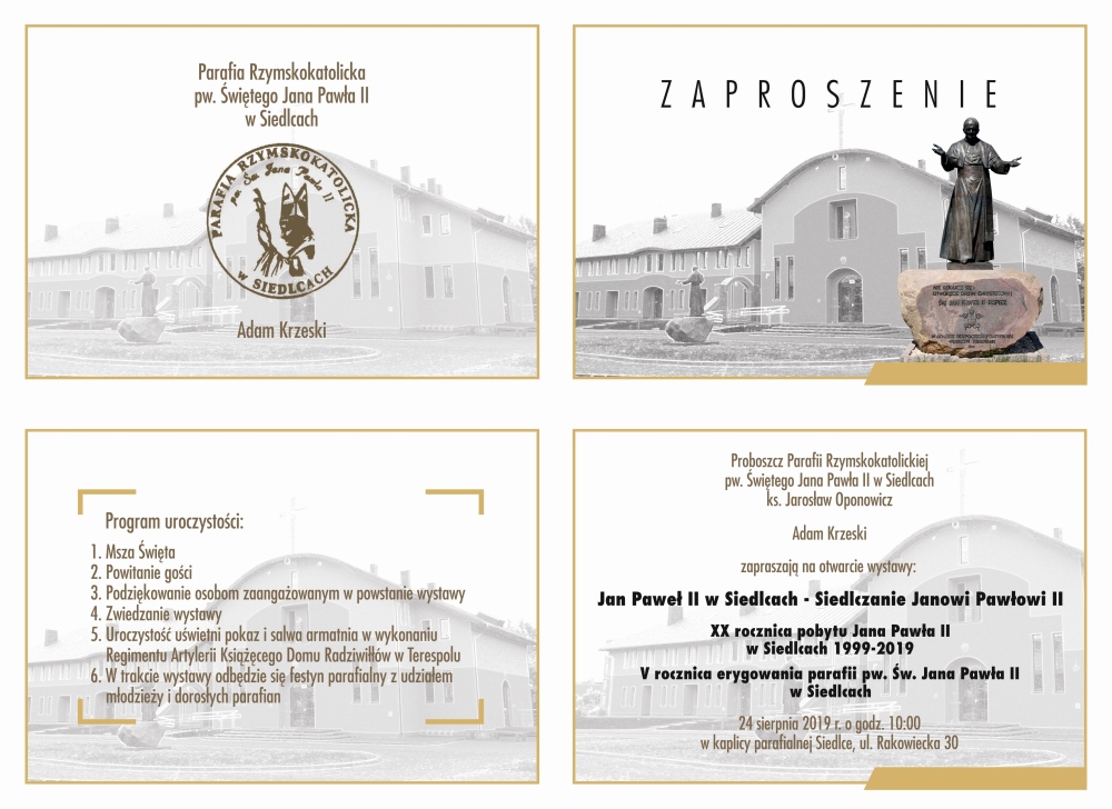 Festyn parafialny z okazji 5 rocznicy powstania parafii odbędzie się dnia 24 sierpnia, początek Msza Święta o godz. 10.00, otwarcie wystawy rocznicy wizyty Jana Pawła II w Siedlcach oraz inne atrakcje: grill, zjeżdżalnie, badanie słuchu; malowanie twarzy, strzelanie, miasteczko rowerowe, występu zespołu Seniorynki, parafialnej scholi dziecięcej oraz chóru młodzieżowego, ciasta naszych gospodyń, gry i konkursy sportowe. Można przynosić fanty na loterię w tym tygodniu. Zakończenie godz. 15.00