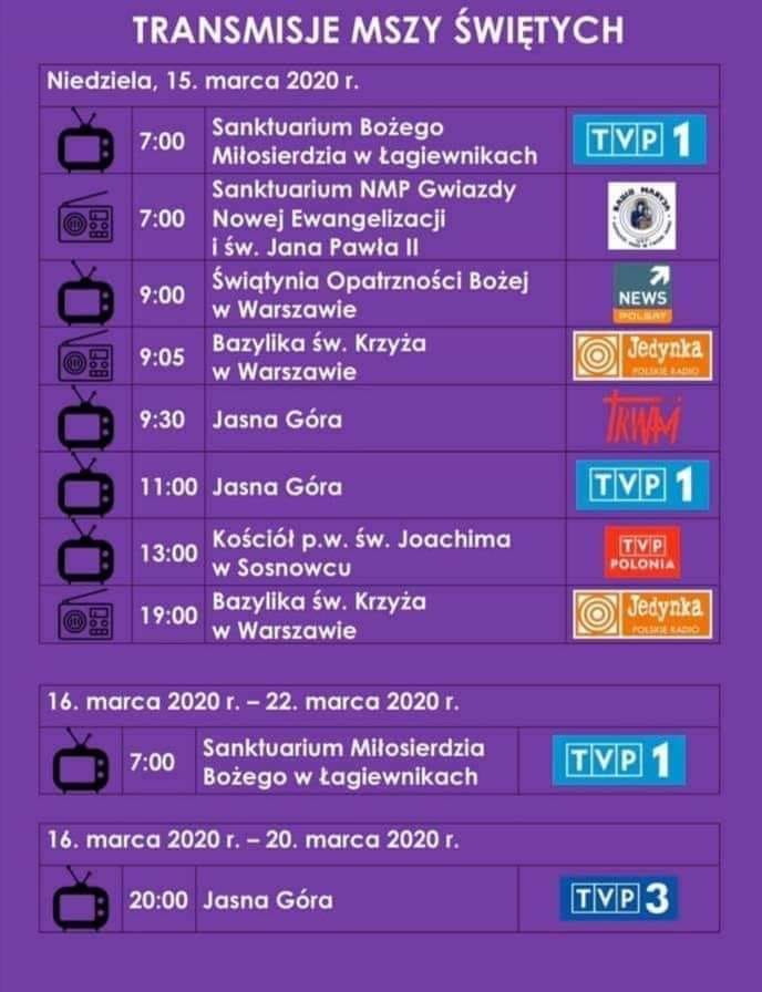 – godziny Mszy Świętych w niedzielę w naszej parafii pozostają bez zmian, tzn 7.00, 9.00, 10.30, 12.00, 18.00, niemniej z wielkim bólem serca ale zgodnie z wytycznymi Kościoła upraszamy aby najbliższe niedziele pozostać w domu i uczestniczyć w Mszach Świętych przez transmisję. Na każdej Mszy Świętej będzie mogło być tylko 5 osób, które zajmą miejsca w pewnej odległości od siebie w kaplicy. Ks. Biskup nie podjąłby takiej decyzji, gdyby sytuacja nie była poważna. Choć to Chrystus jest Panem wszystkiego, my musimy uczynić co w naszej mocy aby nie zarazić się. Prosimy o przekazanie informacji starszym, którzy nie czytają internetu.